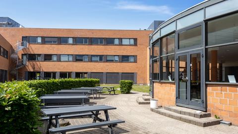 Kontor med kantine og parkeringspladser ved døren
